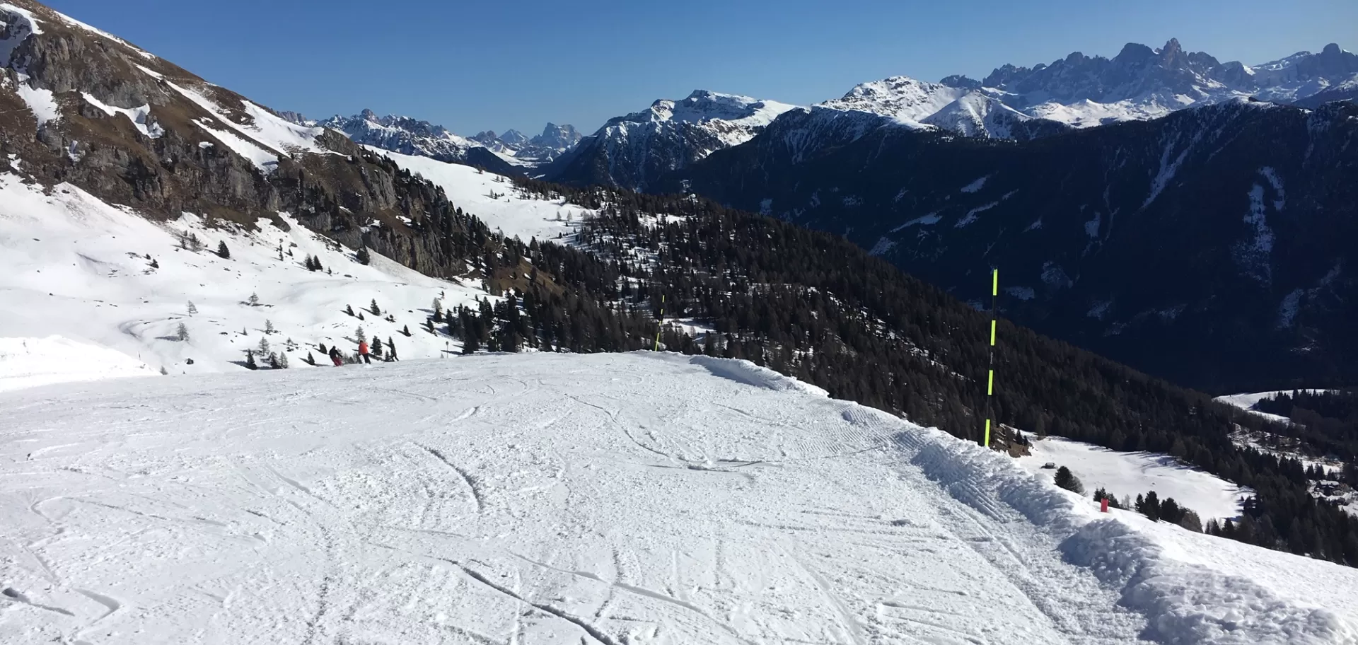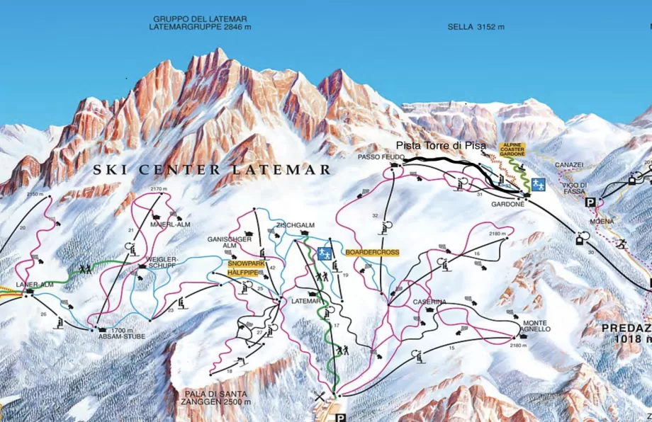 Scesi dalla seggiovia, scendendo verso Predazzo si hanno due possibilità: imboccare la pista rossa Cinque Nazioni o tenere la sinistra e imboccare la pista nera Torre di Pisa.