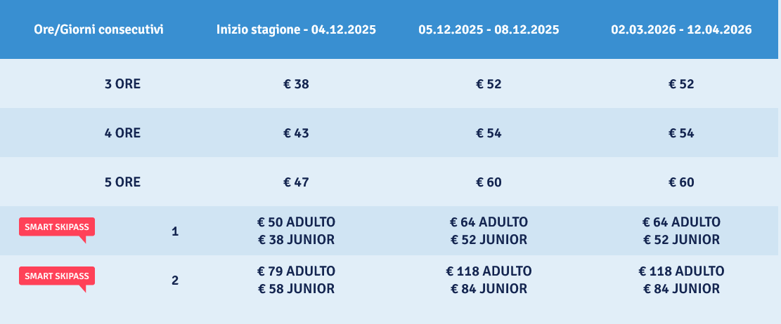 LISTINO PREZZI SKIPASS 2025 - 2026 - comprensorio Pontedilegno Tonale - ex ADAMELLO SKI
