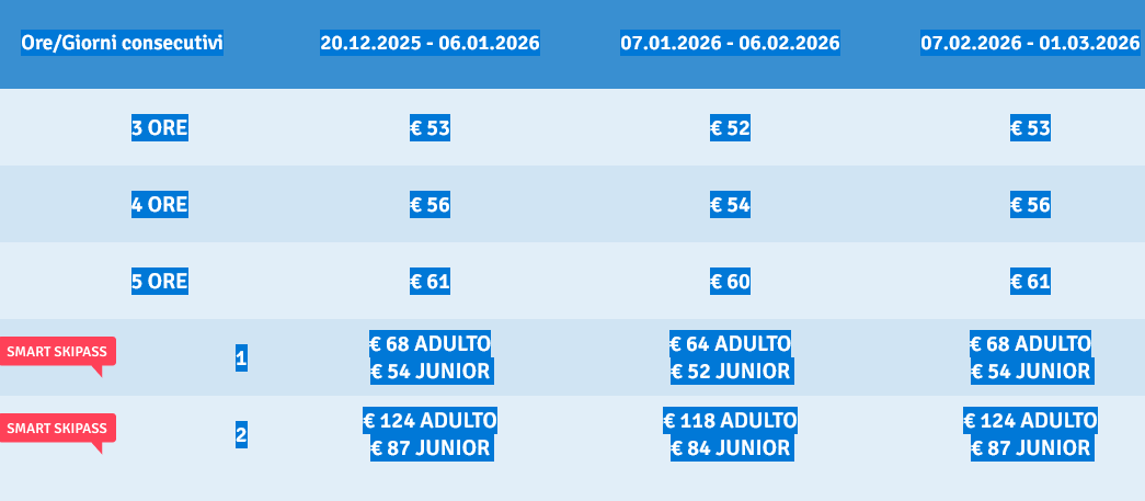 Gratuito con skipass da 3 a 14 giorni consecutivi e skipass stagionale.