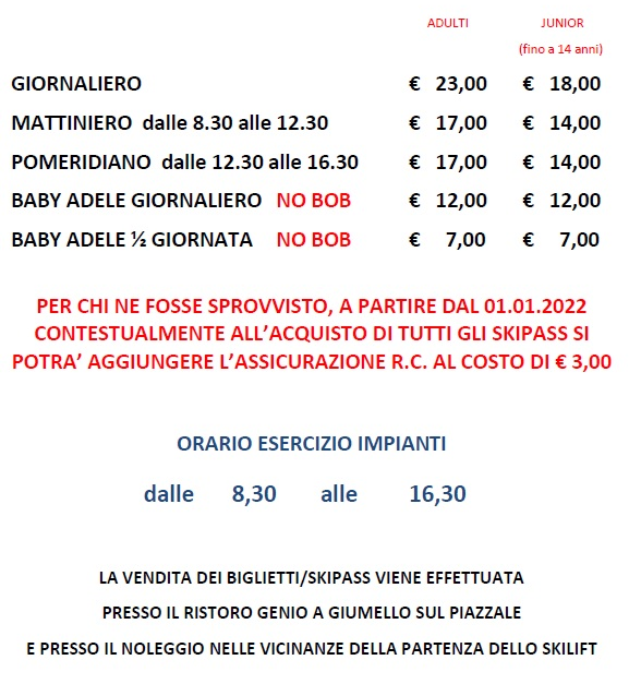 LISTINO PREZZI ALPE GIUMELLO 2025 - 2026