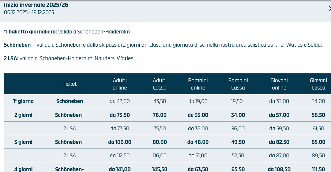 LISTINO PREZZI SKIPASS BELPIANO 2025 - 2026