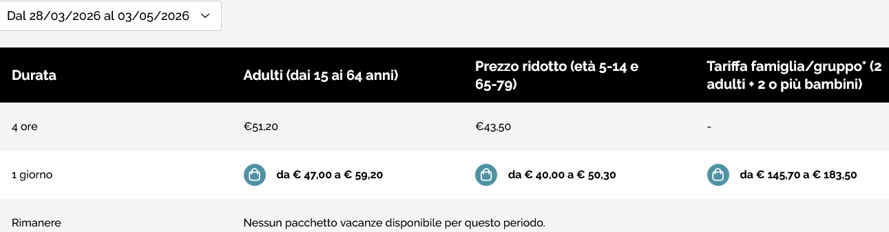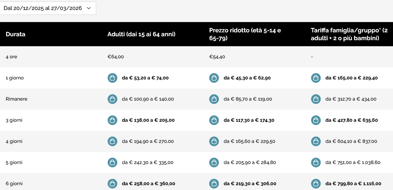 Prezzo skipass giornaliero intero: sino a 74,00
