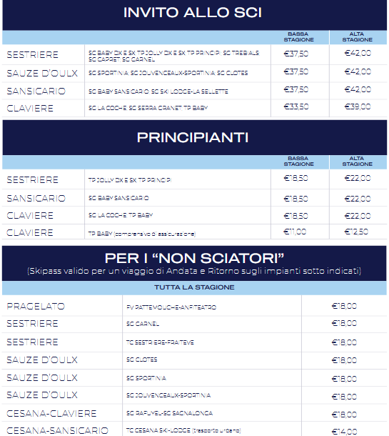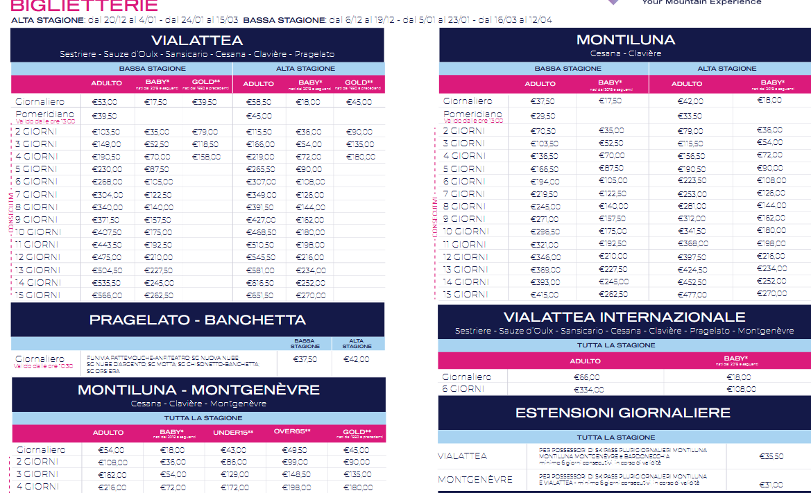 LISTINO PREZZI SKIPASS 2025 - 2026 VIA LATTEA