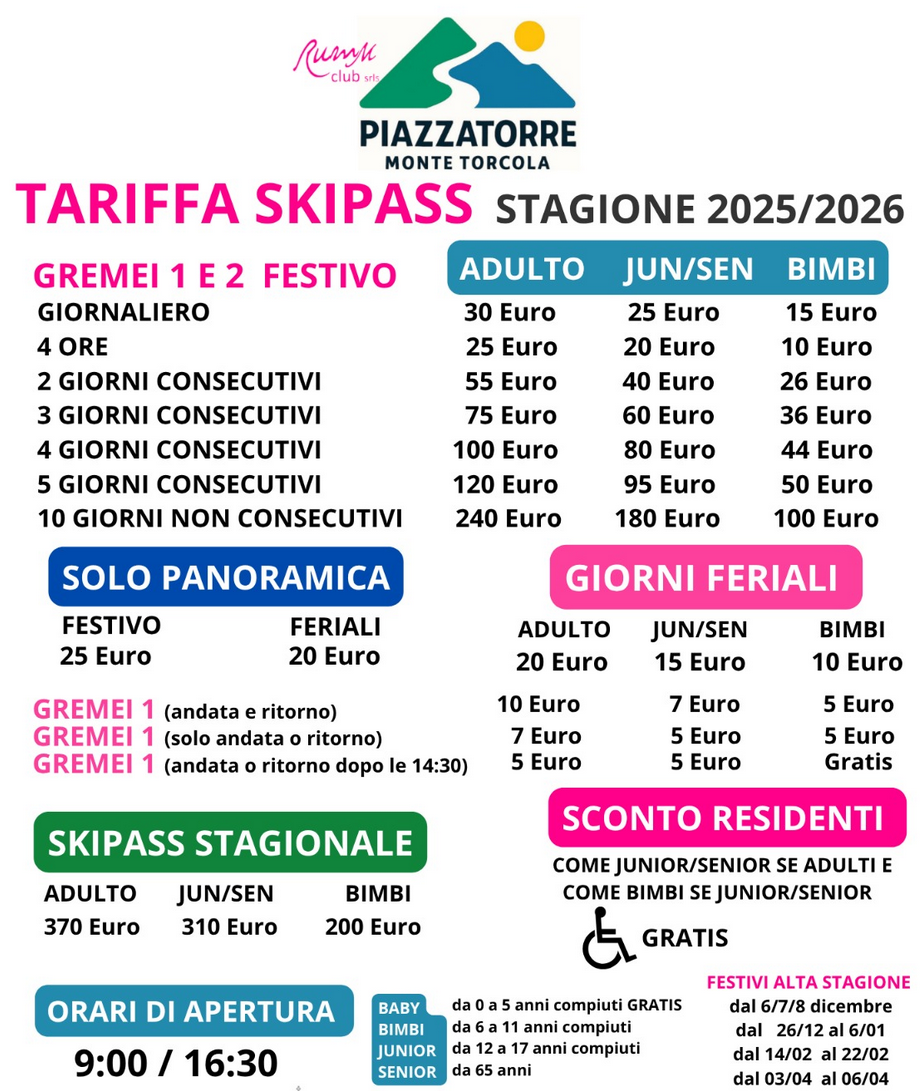 LISTINO PREZZI SKIPASS PIAZZATORRE 2025 - 2026