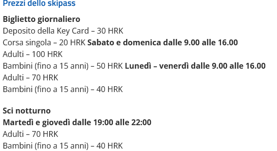 Skipass giornaliero adulti 100 HRK (kuna croato) - euro 13,27 circa al cambio attuale