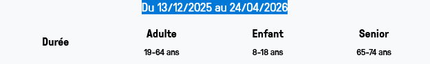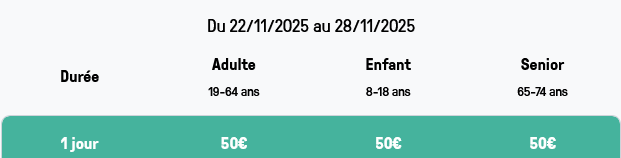 + Les forfaits sont OFFERTS pour les - de 8 ans et les 75 ans et +. Ces forfaits sont disponibles uniquement aux points de vente sur présentation d'un justificatif d'âge.