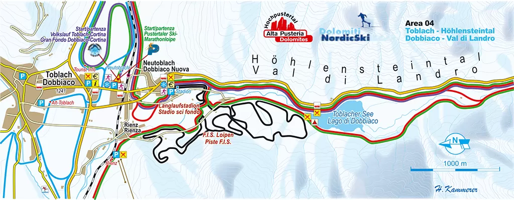 La Nordic Arena comprende 5 tracciati omologati Fis, la pista Stephanie di 3,3 km, la pista Natalie di 5 km, la pista Ole di 3,7 km, la pista Saskia di 5 km e la Albert Stadion Sprint di 1, 3km, come vedete nella mappa qui sopra. Ogni anno il comprensorio ospita appuntamenti di portata internazionale come il Tour de Ski, la Pustertaler Ski-Marathon e la Granfondo Dobbiaco - Cortina. Si tratta di un vero e proprio gioiello per la pratica agonistica dello sci di fondo con la pista che passa addirittura sopra il tetto del centro fondo.