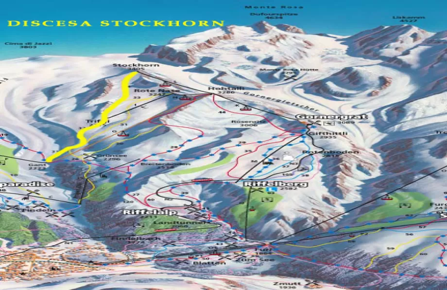 La storica funivia Hohtalli - Stockhorn portava una ventina di sciatori per volta sino ai 3405 m proprio di fronte al massiccio del Monte Rosa. Lo scenario che si offriva al turista era davvero unico, con numerose vette che superano i 4000 (Monte Rosa, Liskamm, Breithorn...) e maestosi ghiacciai con profondi crepacci. Ora invece solo pochi possono salire sino a qui, salendo a piedi o con gli sci d'alpinismo. Esiste un solo percorso che scende. Era segnato sulle cartine con una linea gialla e chiaramente indicato in loco. Ma non veniva battuto dai gatti delle nevi. Per questo motivo dopo una nevicata si poteva trovare neve completamente vergine mentre era frequente trovare la pista è invece piena di gobbe per il passaggio degli sciatori. Il tracciato seguiva inizialmente la linea della funivia con un lungo muro di discreta pendenza e pieno di gobbe. Questa era la parte più difficile, poi seguiva un tratto più semplice con tratti pianeggianti intervallati da muri non troppo difficili ma sempre piuttosto segnati dal passaggio degli sciatori. Nella parte bassa erano invece lunghi tratti pianeggianti e stretti, questa volta con un fondo omogeneo, con qualche curva e qualche tornante stretto. Nulla di difficile, qui ci si poteva riposare e ammirare il lato svizzero del Cervino. La pista era molto lunga e il dislivello considerevole. La partenza era a 3405 e l'arrivo a 2223 m a Gant. Era auspicabile affrontare la pista con un certo allenamento per poter assecondare l'asperità del terreno.