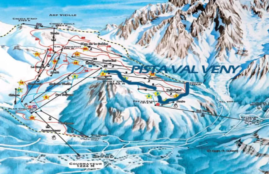 La pista n. 2 Val Veny è una pista molto panoramica posta nella parte ovest del comprensorio di Courmayeur, proprio di fronte al massiccio del Monte Bianco. La pista scende da 2080 metri subito sotto il Mont Chetif sino a 1525 metri in fondo alla Val Veny. La pista inizia all'arrivo delle seggiovie Zerotta e Dzeleuna con un breve muro generalmente piuttosto affollato. Subito dopo gira a destra e passa sotto la seggiovia Zerotta. Qui inizia un lungo tratto pianeggiante che, dopo aver incrociato una bellissima rossa (la Gigante) continua nel bosco. Il Monte Bianco è alla tua sinistra e si mostra in tutta la sua bellezza. La pista qui è piuttostro stretta ma comunque facile grazie alla scarsissima pendenza. Eccoti a Pré de Pascal dove ci sono diversi rifugi e l'arrivo della funivia. Gira a sinistra e continua a seguire la stradina che ritorna nel bosco. A questo punto il Monte Bianco è alla tua destra. Continua a scendere e troverai qualche muro non particolarmente impegnativo, se non quello che inizia poco dopo la partenza della seggiovia Peindent. Gli scenari sono comunque di primordine grazie agli spettacolari scorci sulla Val Veny e sul ghiacciaio del Miage. Una curva a destra e un tornante sulla sinistra ti lanciano nell'ultimo pianoro prima di arrivare alla partenza della seggiovia Zerotta, proprio nel fondovalle.