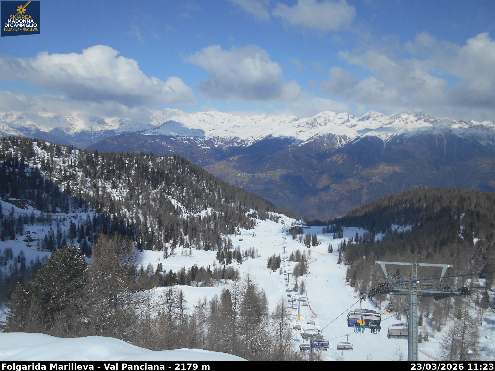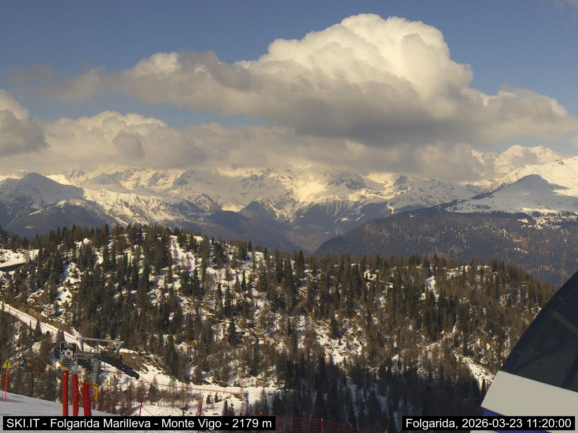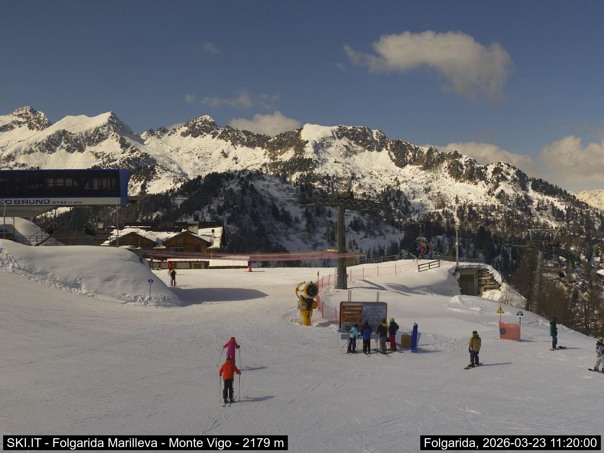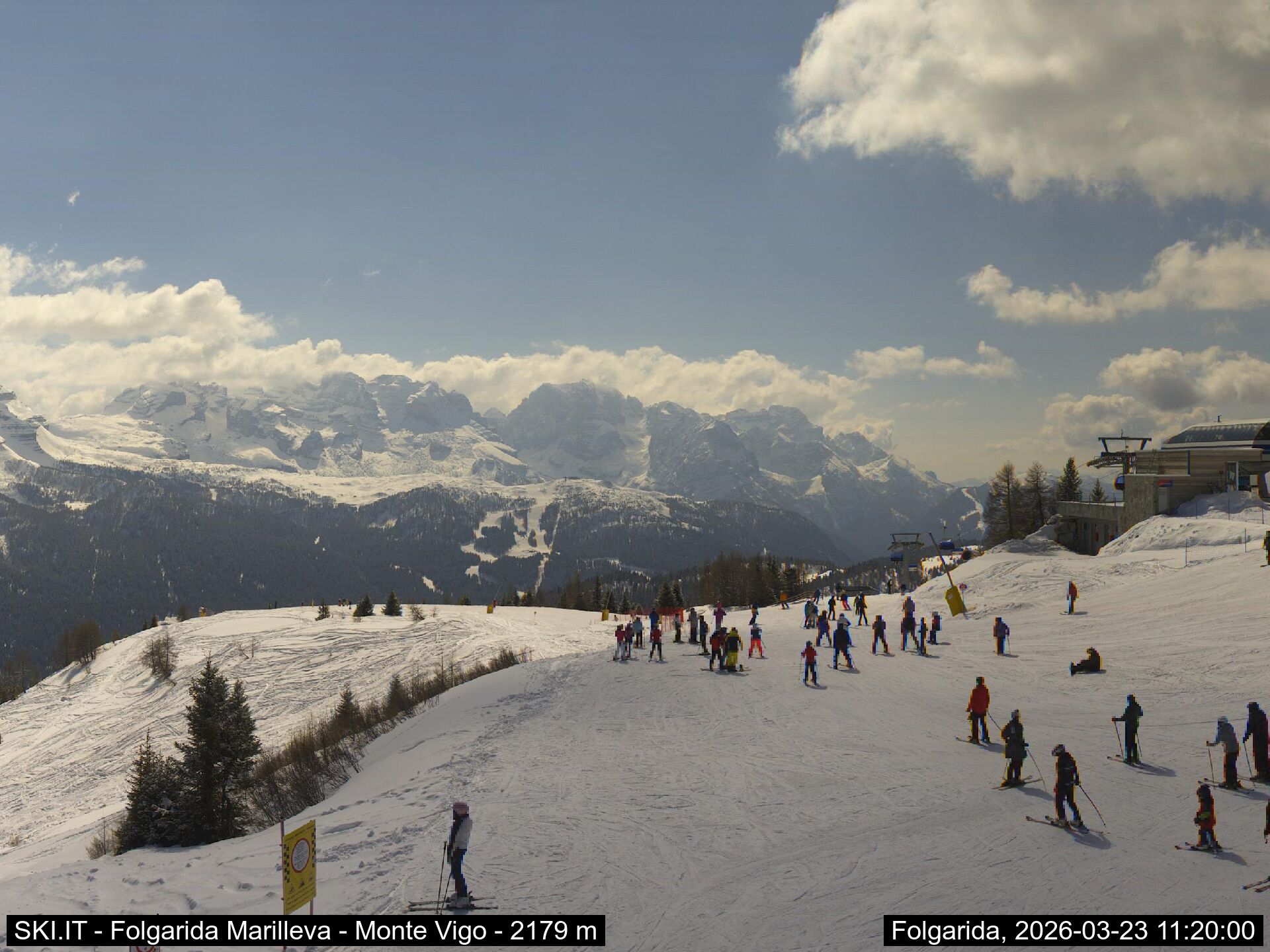 Webcamlive Folgarida - Marilleva. Le webcam sul comprensorio sciistico di Marilleva, in Val di Sole (Trentino). Le webcam permettono di vedere l'innevamento e le condizioni meto sul Monte Vigo, Mlaghet Aut, Daolasa, sul Monte Spolverino, una webcam inquadra poi il Gruppo del Brenta visto dalle piste di Marilleva.