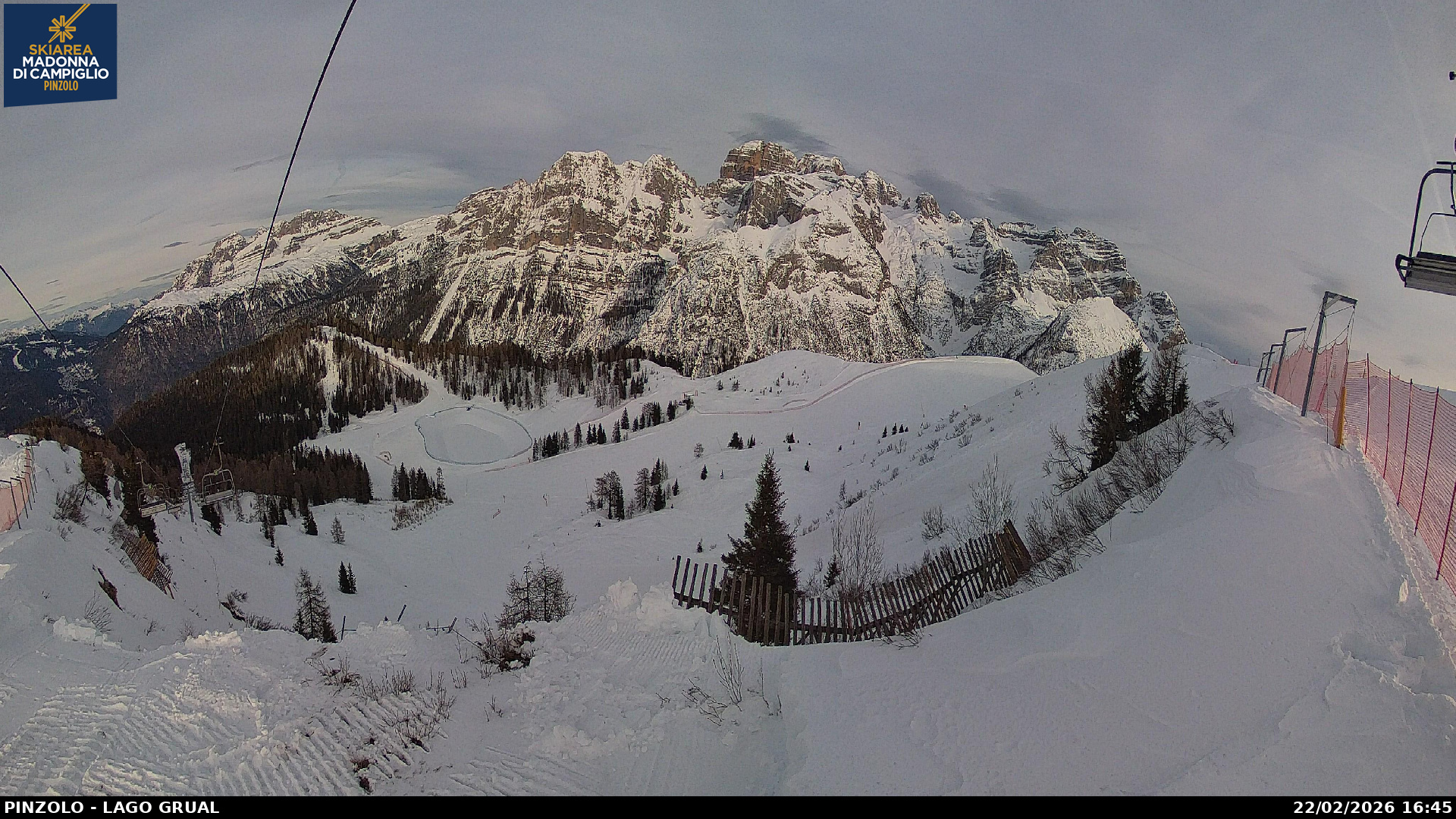 Webcam panoramica Pinzolo. Le webcam sul comprensorio sciistico di Pinzolo, collegato sci ai piedi con Madonna di Campiglio, in Trentino. Le webcam inquadrano la pista Tulot, il lago Grual e Malga Cioca.