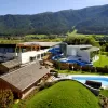 Piscina scoperta nella zona sportiva di Brunico, con una vasca olimpionica da 50 metri, vasca per bambini, grande prato e un ristorante con grandeterrazza...