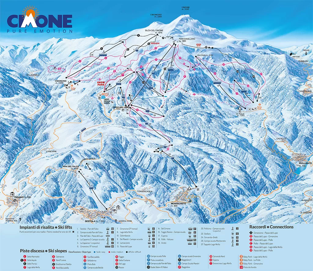 le piste sono tutte molto belle..tranne la 8 (che porta al cimoncino) che dalla cartina sembra lunga e divertente ma in realtà è un collegamento stretto e fastidiosissimo che scende giù a zig-zag e sembra non finire mai.Il collegamento C è molto pianeggiante ma si snoda in mezzo ad un boschetto ed è quindi molto carino(decadente visto che è circondato da natura morta). Consigli pratici: