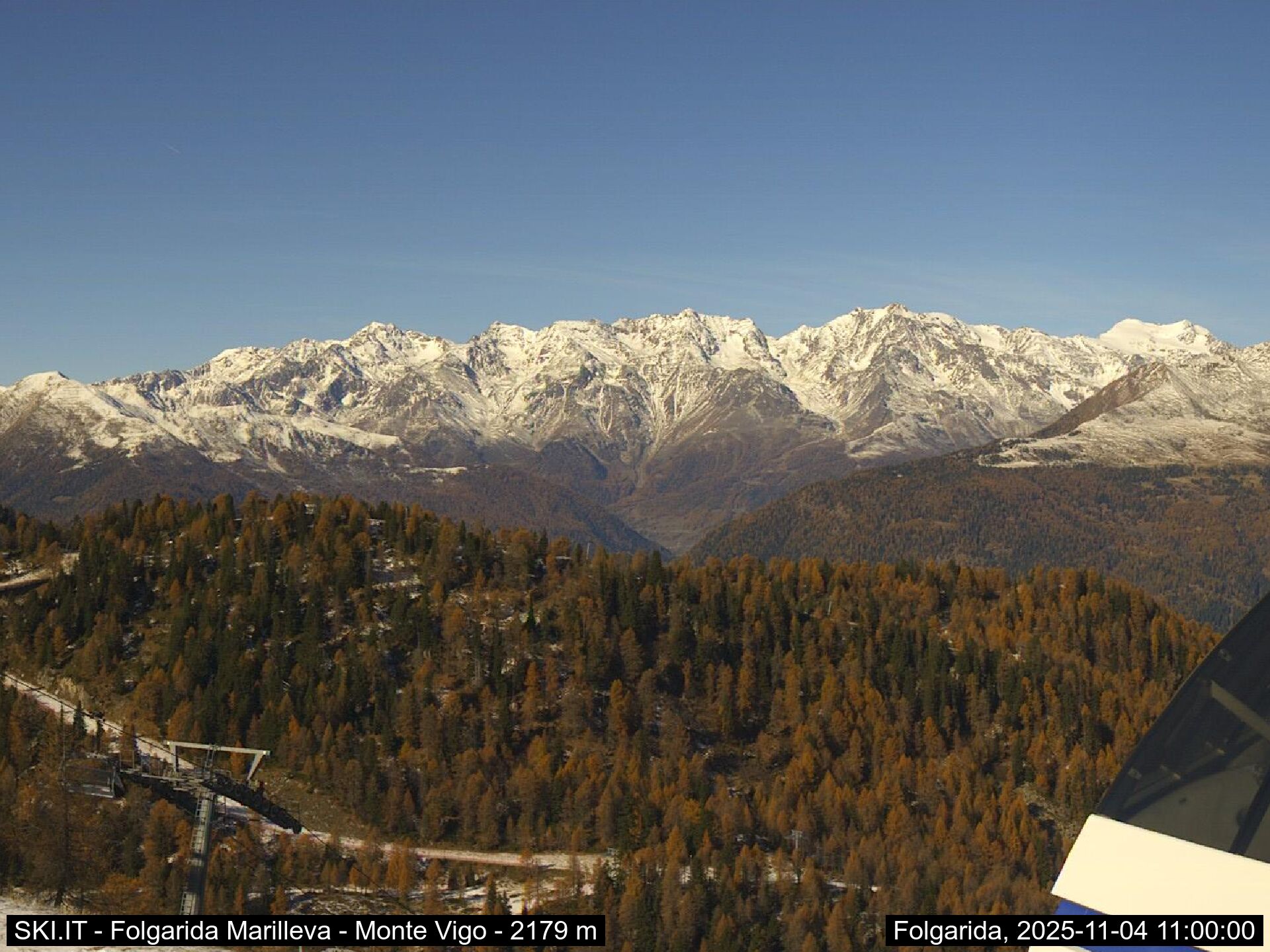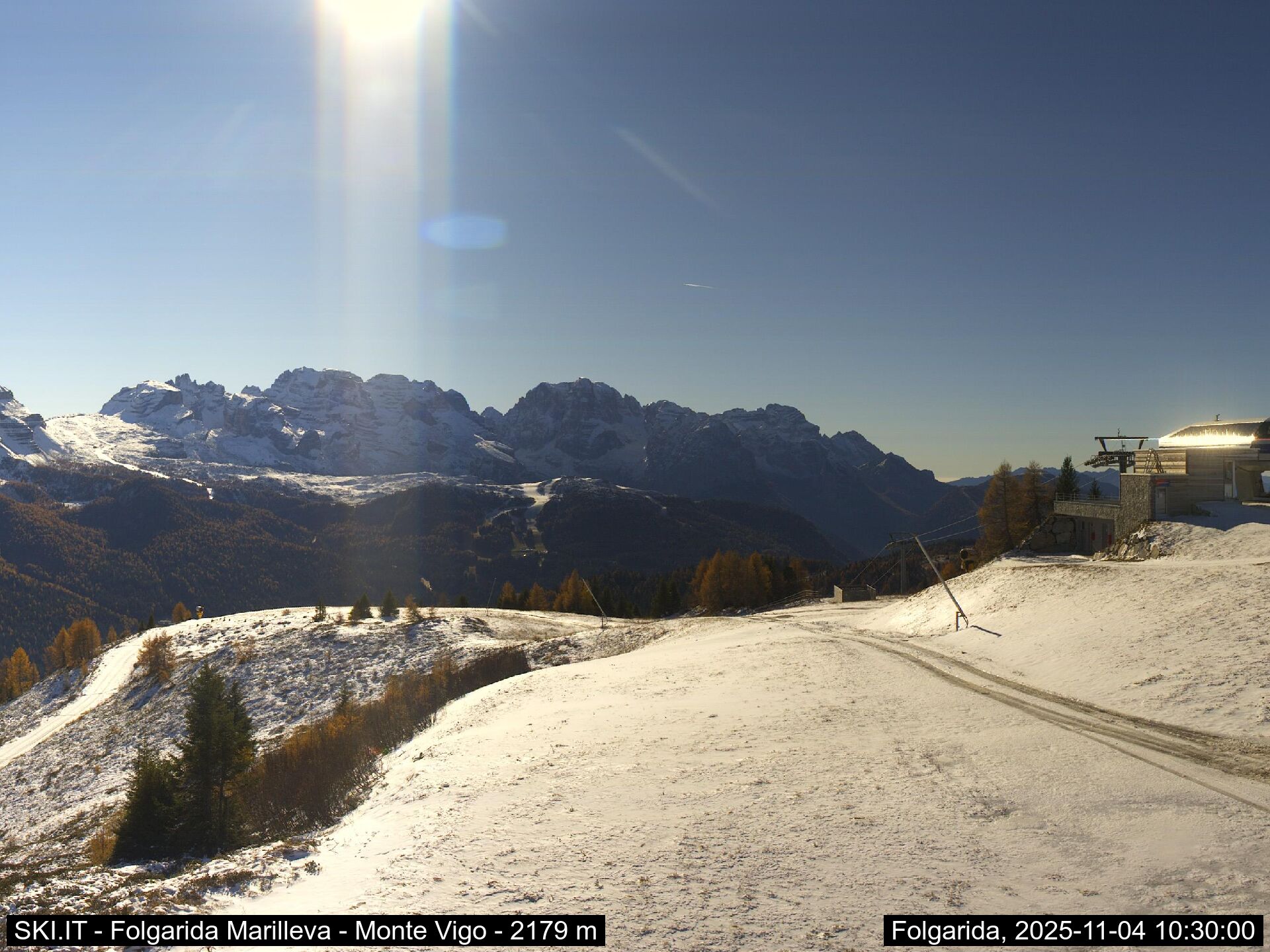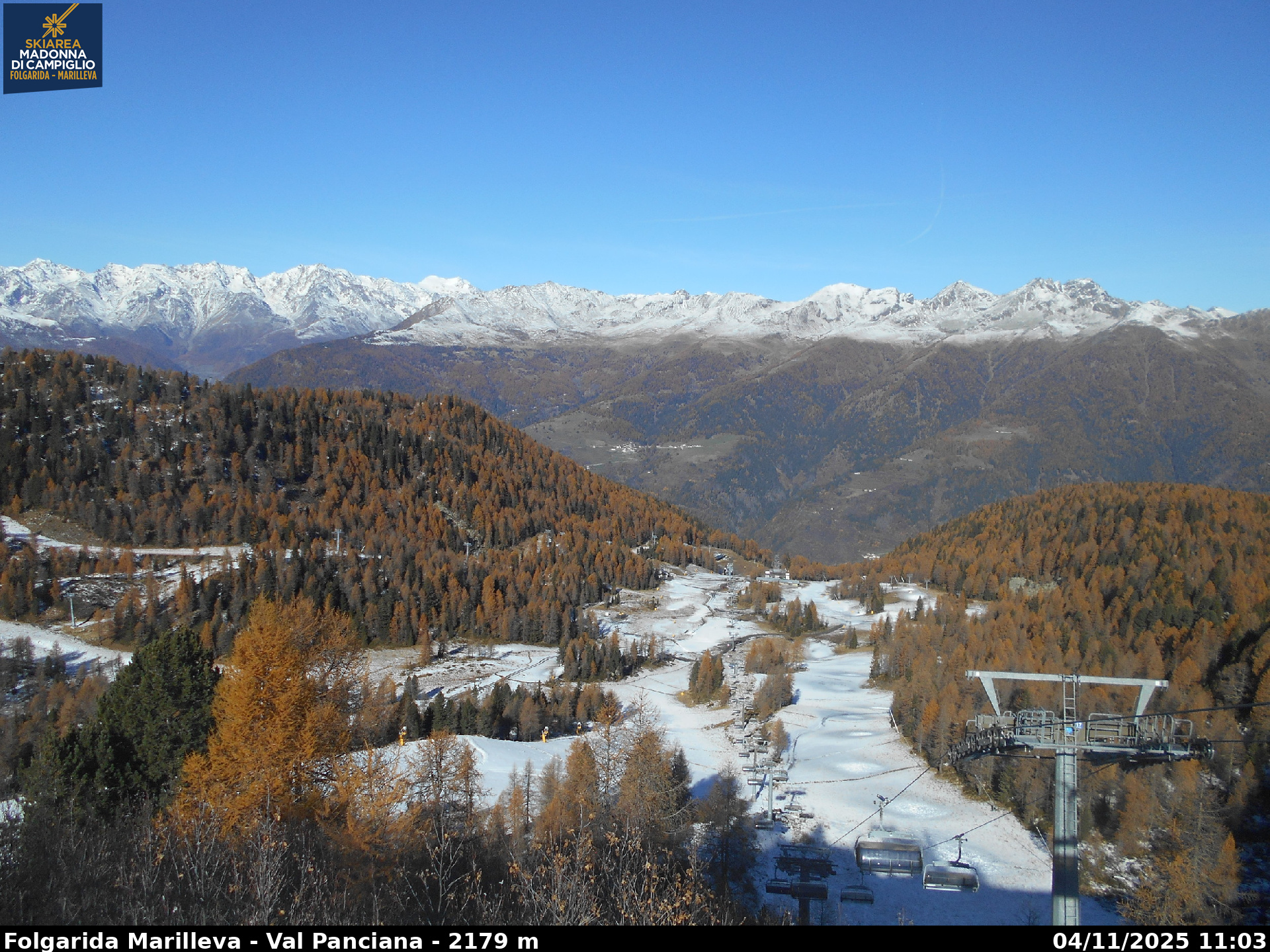 Webcamlive Folgarida - Marilleva. Le webcam sul comprensorio sciistico di Marilleva, in Val di Sole (Trentino). Le webcam permettono di vedere l'innevamento e le condizioni meto sul Monte Vigo, Mlaghet Aut, Daolasa, sul Monte Spolverino, una webcam inquadra poi il Gruppo del Brenta visto dalle piste di Marilleva.