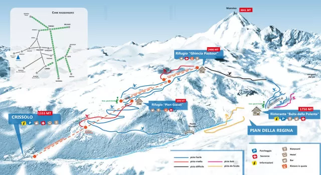 E' inoltre la più importante stazione sciistica dell'Alta Valle Po con i suoi 10 km di piste per lo sci alpino. I tre impianti raggiungono la sommità del Monte Ghincia Pastour a quota 2.300 m e congiungono sci ai piedi Crissolo con Pian Regina. La seggiovia parte dal paese e conduce gli sciatori in quota, lì la pista Granero Lungo è dotata anche di innevamento artificiale. A Pian Regina è inoltre disponibile un tapis roulant che serve tre piste verdi (0,5 km tot.) della lunghezza di 180 metri. Sono presenti due aree gioco dedicate ai bambini che con o senza sci possono divertirsi in una zona dedicata tutta a loro e ai genitori e si tr...