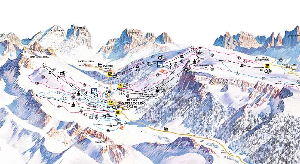 Passo San Pellegrino - Falcade è di gran lunga il più bel comprensorio delle Tre Valli. Quello con più piste, con più altitudine e con più dislivello. Gli impianti sono moderni ed efficienti. I 60 km di piste sono per tutti i gusti e sono sufficienti per passare una bella giornata sugli sci.