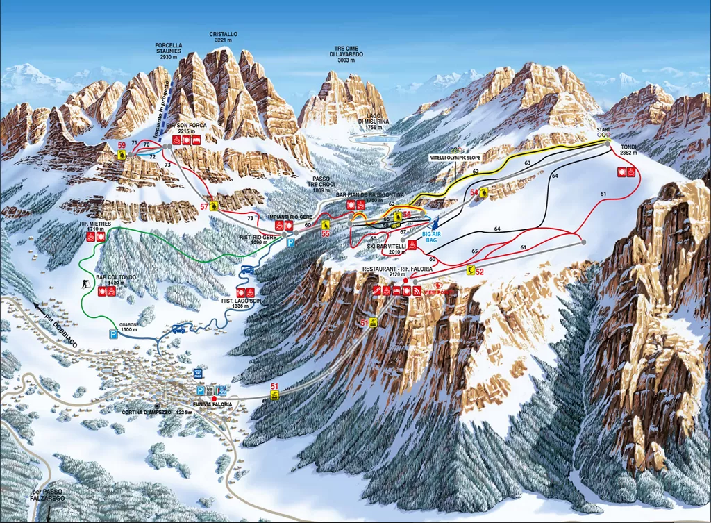 La funivia di arroccamento porta a 2120 metri di quota dove si apre il comprensorio sciistico che è servito da 5 seggiovie e uno skilift. Le piste arrivano fino alla quota di 2362 metri dell'attacco della pista Tondi che (con la Vitelli) è una delle più interessanti del comprensorio sciistico di Cortina e ospita ogni anno gare di Coppa del mondo di snowboard. Con gli sci ai piedi si arriva fin sotto il monte Cristallo, in zona Son Forca, dove un tempo partiva la suggestiva cabinovia Forcella Staunies, da dove parte il mitico itinerario fuoripista omonimo.