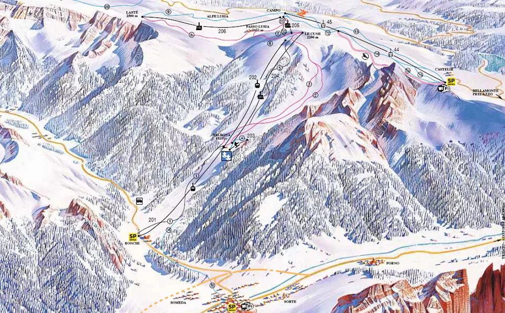 Le piste di sci alpino sono adatte a tutti i livelli sciistici e si estendono per 26 kilometri: il versante nord, verso Moena, conta perlopiù piste rosse e nere con muri da brividi; tra i tracciati è da non perdere l'entusiasmante nera Fiamme Oro. Il lato sud dell'Alpe Lusia (Castelir-Bellamonte), più soleggiato e tranquillo, è il regno delle famiglie e di chi muove i primi passi sulla neve. Su questo versante verso Bellamonte, c’è anche lo snowpark, un tracciato per il boardercross lungo circa 800 metri e largo 6, di media difficoltà. A Bellamonte in loc. Le Fassane ci si può divertire sulla pista per slittini "Fraina", un tracciato di 2100 m di lunghezza. "Lusialand" è il parco giochi sulla neve all’Alpe di Lusia per i bambini a partire dai 3 anni.