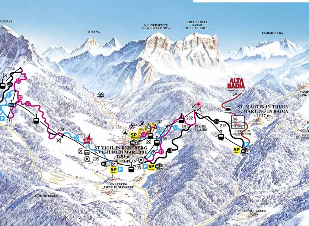 La skiarea di Plan de Corones comprende oltre San Martino in Badia, Brunico, Valdaora, San Vigilio di Marebbe, collegate sci ai piedi.