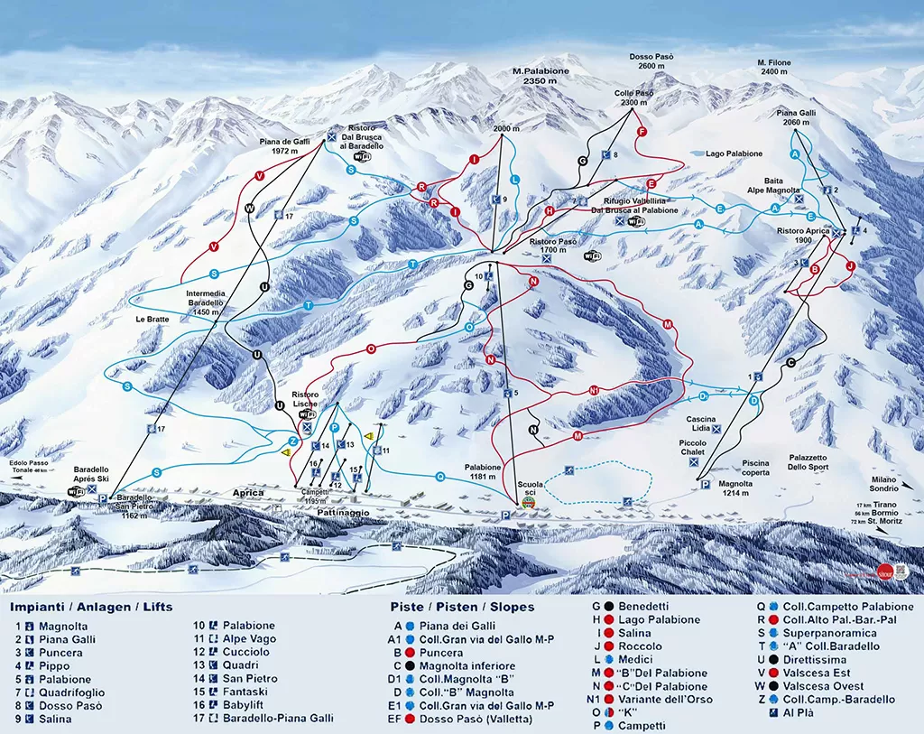 La skiarea è divisa in 4 zone collegate tra loro: il Baradello con 15 km di piste servite da una seggiovia quadriposto carenata che raggiunge quota 2000 m circa; nella zona Palabione c'è la maggior parte degli impianti con oltre 20 km di piste che da m 2300 scendono in paese. Qui molto bella è la pista Dosso Pasò. Nella terza area, la Magnolta le piste raggiungono quota 2100 metri circa, con collegamento in quota da e per il Palabione: la Granvia del Gallo; la pista Magnolta è conosciuta per la sua difficoltà e lo snowpark. L' Initial Park è la struttura sportiva per snowboarder e sciatori freestyle, servito da uno skilift illuminato di sera. L...