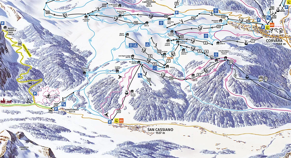 San Cassiano è infatti collegato sci ai piedi sia con Arabba che con Corvara e da qui alle altre vallate toccate dalla Sellaronda. Molto belle anche le piste che scendono da Piz Sorega sino al paese. E' possibile arrivare a San Cassiano anche dal Pordoi scendendo verso la Val Badia grazie ad una lunga e bellissima pista che termina con un lungo falsopiano poco prima di Armantarola dove trovate alcune slitte trainate da cavalli pronte a trainarvi sino al più vicino skilift. Dopo una breve risalita con lo skilift ad Armentarola si potrà nuovamente scendere sino ad arrivare a San Cassiano e risalire al Pordoi tramite un servizio di autobus.