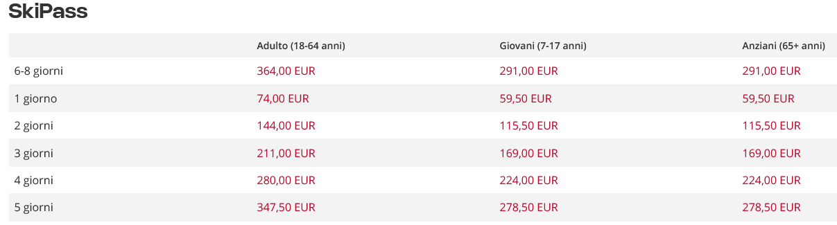 Prezzo skipass giornaliero intero: 74,00