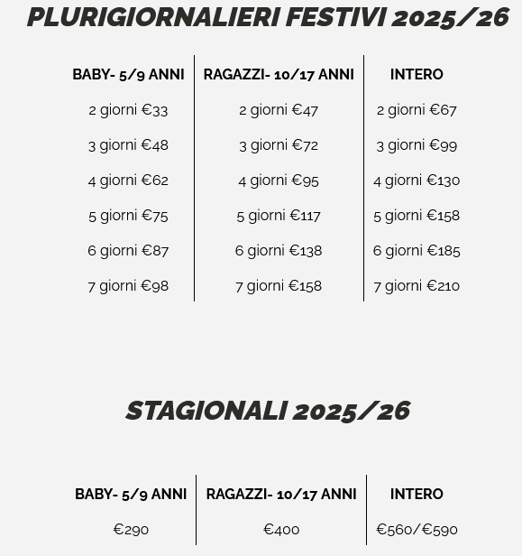 LISTINO PREZZI SKIPASS LIZZOLA 2025 - 2026