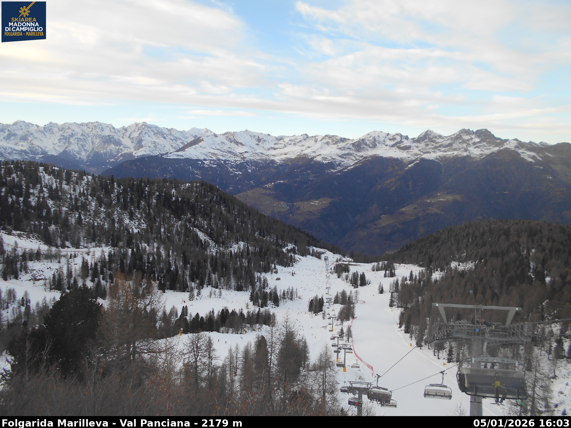 Webcamlive Folgarida - Marilleva. Le webcam sul comprensorio di Folgarida, collegato con Marilleva e Madonnda di Campiglio, in Val di Sole, Trentino. Dal Monte Spoverino al Monte Vigo con varie panoramiche sulle psite e sulle montagne circostanti (Gruppo Brenta e Ortles Cevedale)